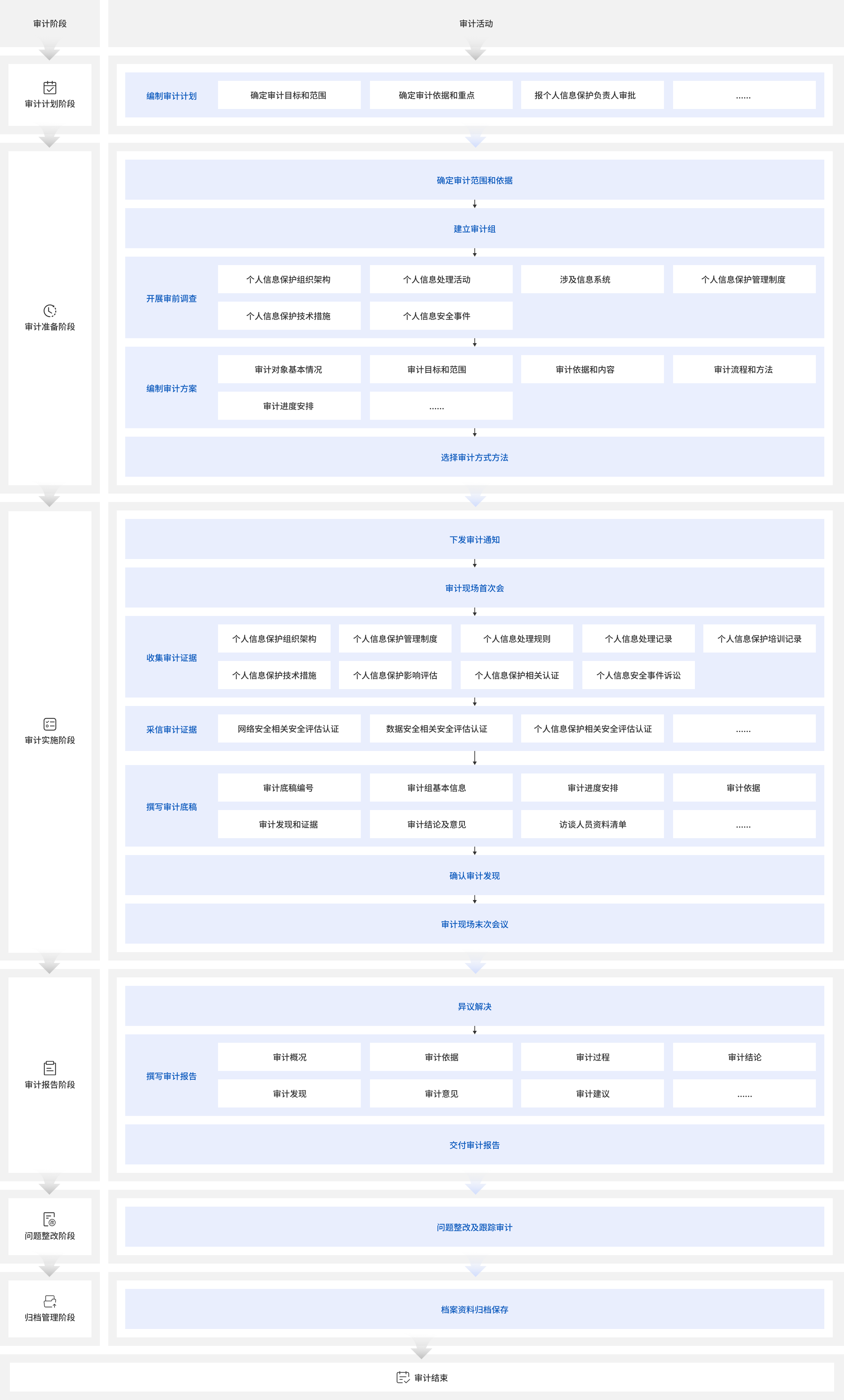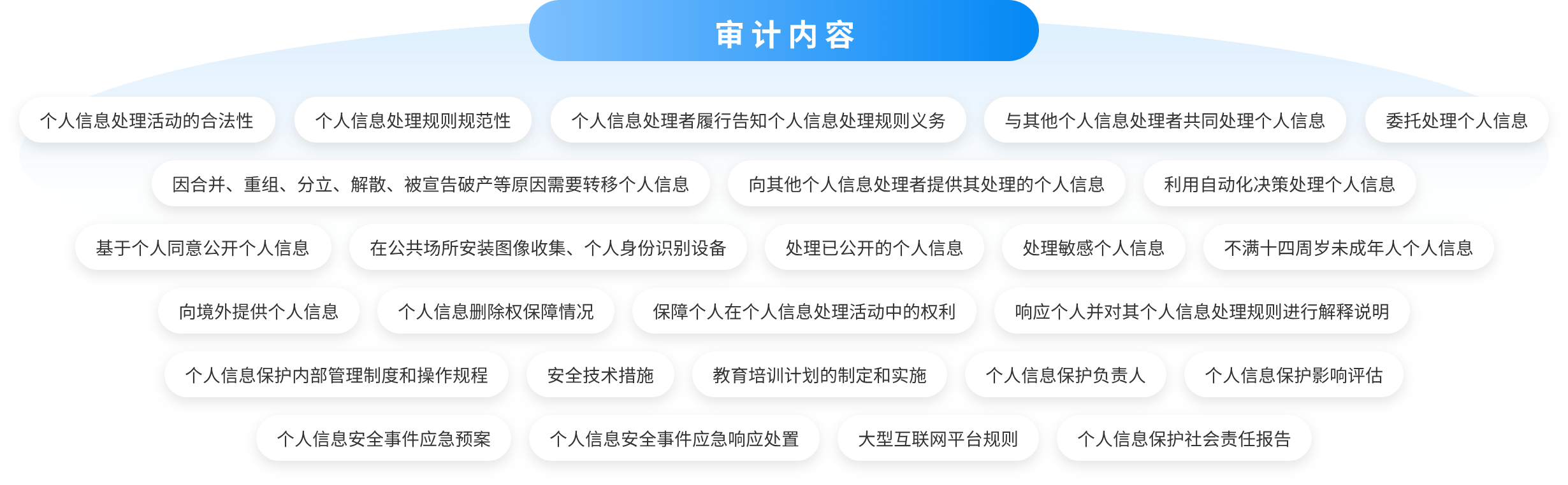 《个人信息保护法》第五十四条明确个人信息处理者应当定期对其处理个人信息遵守法律、行政法规的情况进行合规审计,金盾信安专业技术团队可依据《个人信息保护合规审计管理办法》《个人信息保护合规审计指引》要求,围绕单位个人信息处理活动合法性、个人信息处理规则规范性、个人信息处理者义务履行等26个方面111个要点的合规情况进行审查和评价,识别风险及问题,输出个人信息保护合规审计报告,个人信息处理者可及时整改风险,消除隐患。